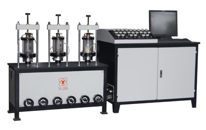 本机是采用电子传感器技术、伺服电机驱动和控制技术、计算机数据采集和处理技术研发的,主要用于土体在三轴压力下长期流变试验。由主机、测控部分、电器和水路控制装置,计算机数据采集和处理四大部分组成,在装好试件后,试验整个过程可以在计算机控制下完成。